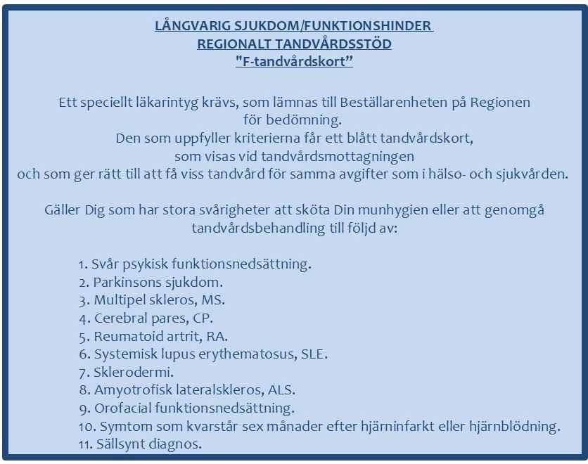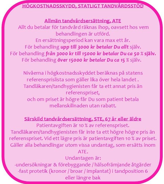 | I receptionen hittar du Therese som fixar det mesta! Dörröppnare, handhållare, tidsbokare, sterilansvarig, telefonsvarare m.m., och assisterar Sara förstås. Vi hanterar inte kontanter! Betala med kort eller Swish efter varje besök. Delbetalning och faktura efter överenskommelse. Väntrumsprislista 260101 Vid vissa tillfällen/åtgärder utföres behandling av Folktandvårdens specialisttandläkare i Gävle, då gäller deras prislista. |